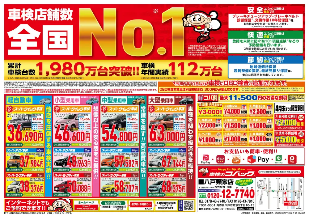 青森県八戸市に車検のコバック八戸類家店・八戸沼館店を構えるナナヨウでは年間6,200台以上の車検を八戸市・階上町・南部町のお客様からお任せいただいております。八戸市を中心にこれほどたくさんの車検をお任せいただけるのは、「必要な整備はきちんとしてほしい。でも、車検費用はできる限り安く」というお客様のご要望に全力でお応えしてきた結果です。