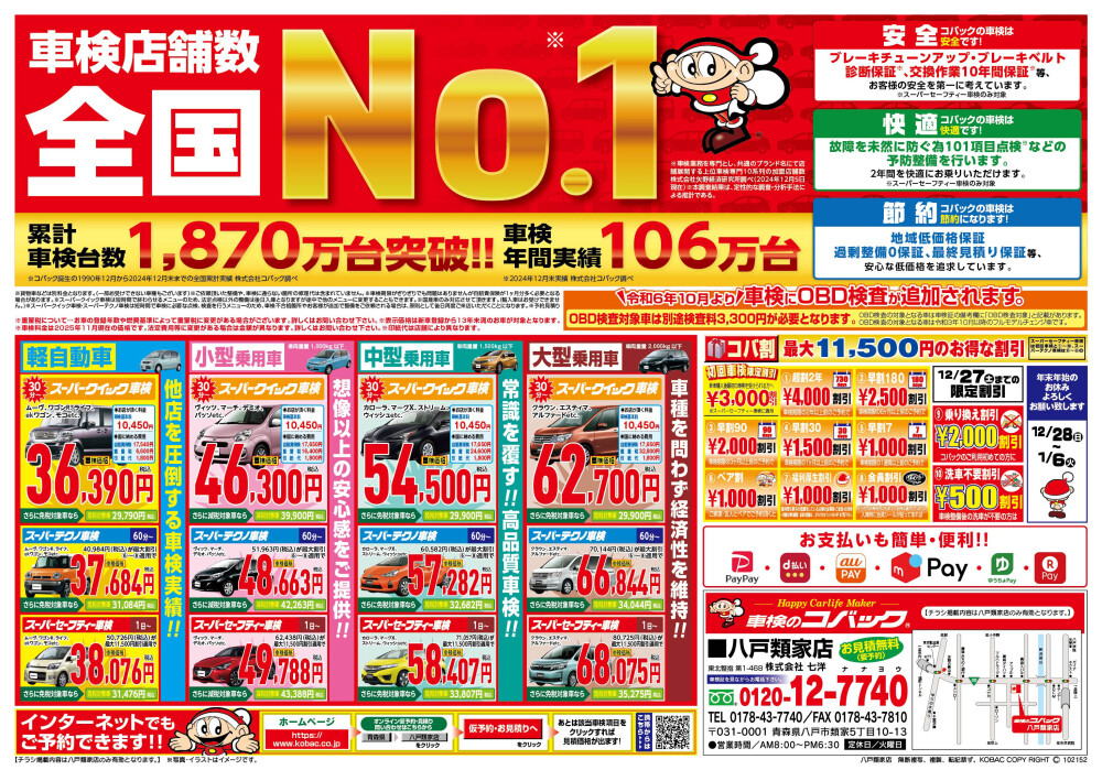 青森県八戸市に車検のコバック八戸類家店・八戸沼館店を構えるナナヨウでは年間6,200台以上の車検を八戸市・階上町・南部町のお客様からお任せいただいております。八戸市を中心にこれほどたくさんの車検をお任せいただけるのは、「必要な整備はきちんとしてほしい。でも、車検費用はできる限り安く」というお客様のご要望に全力でお応えしてきた結果です。